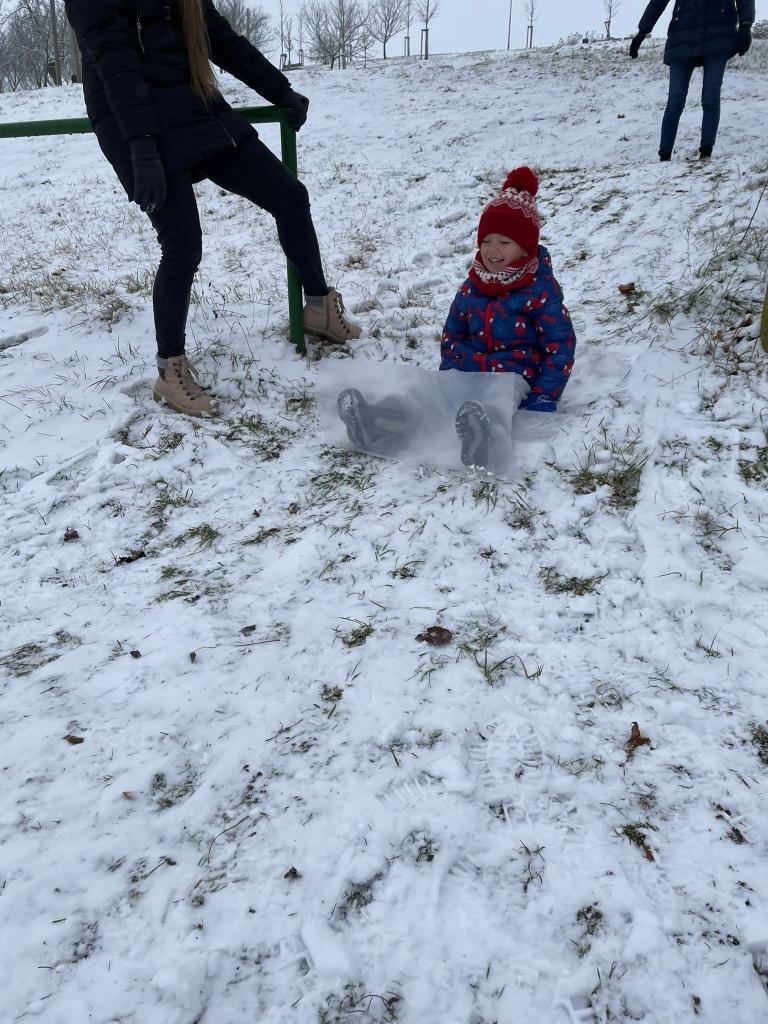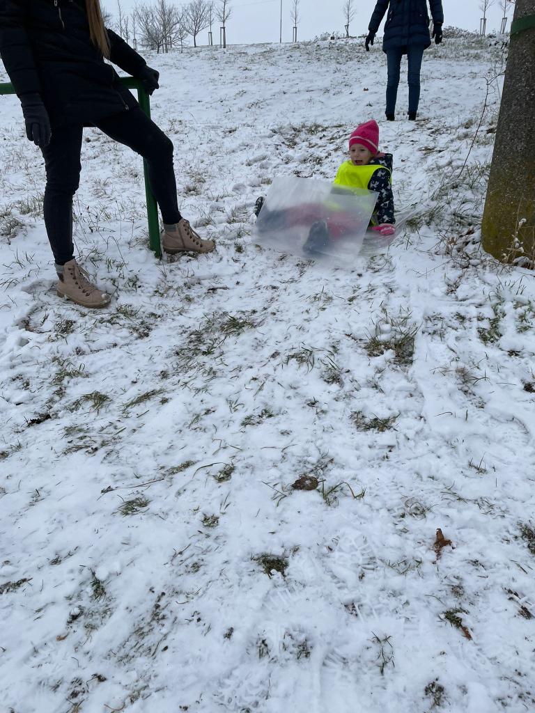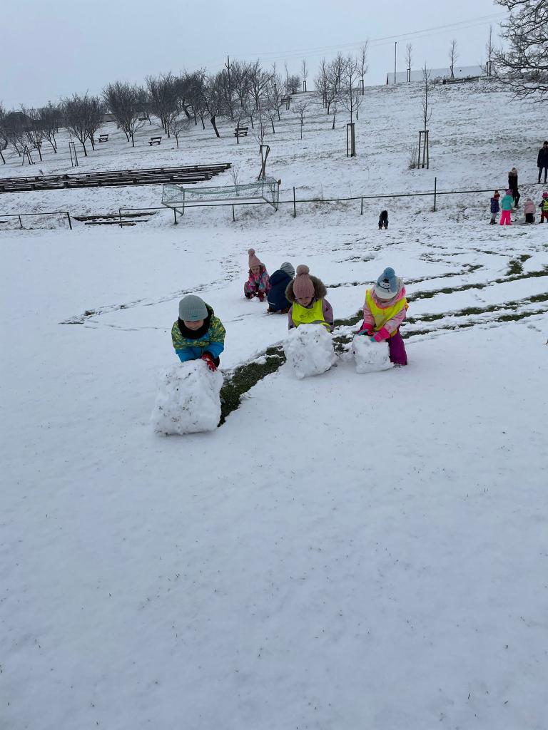 Nakonec jsme si mohli zábavu a hrátky se sněhem naplno užít venku stavěním sněhuláků a jízdou po sněhu.
